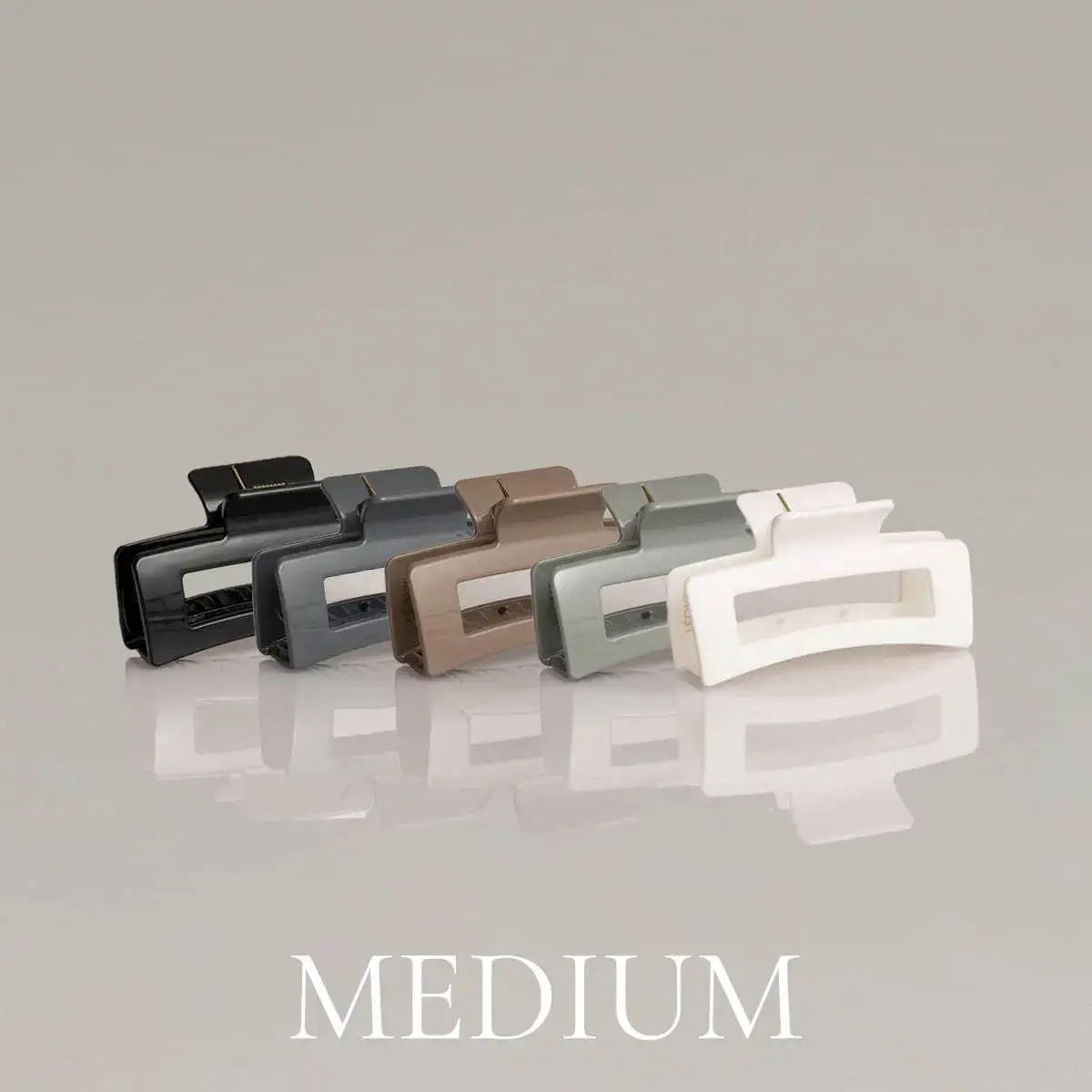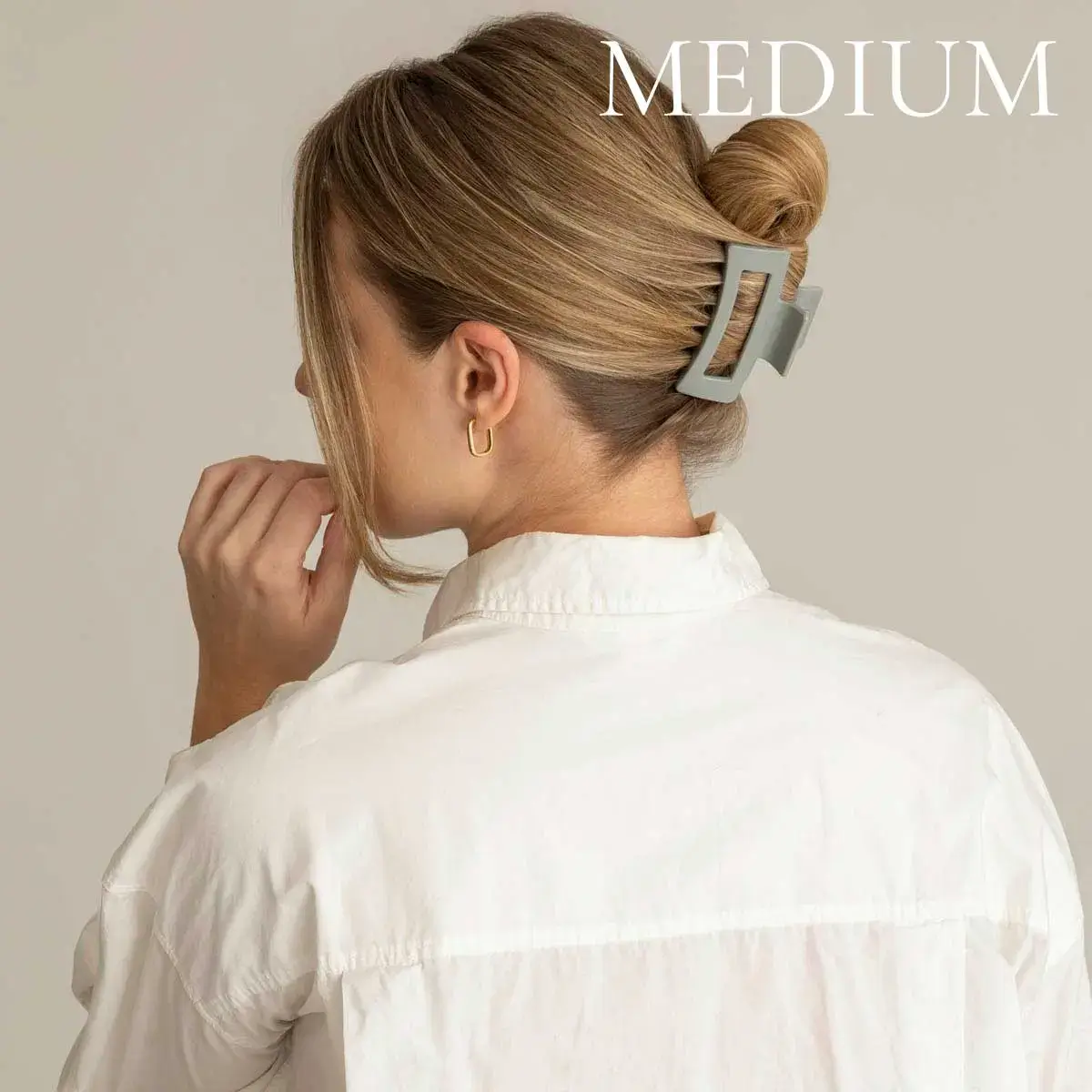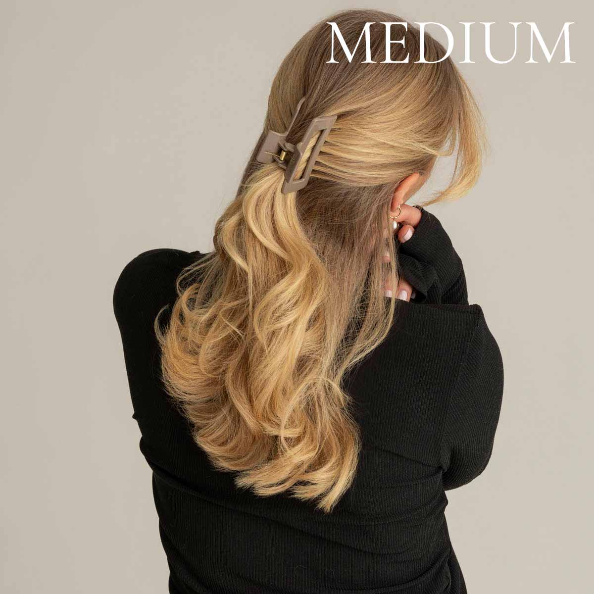 Entdecke fünf elegante Farben in unserer glänzenden Medium-Größe: Eisengrau Glänzend, Salbei Glänzend, Taupe Glänzend, Schwarz Glänzend und Weiß Glänzend. Die Haarklammern haben eine glänzende Oberfläche, griffige Zacken an der Innenseite und eine starke Feder, die die Frisur den ganzen Tag über sicher hält.